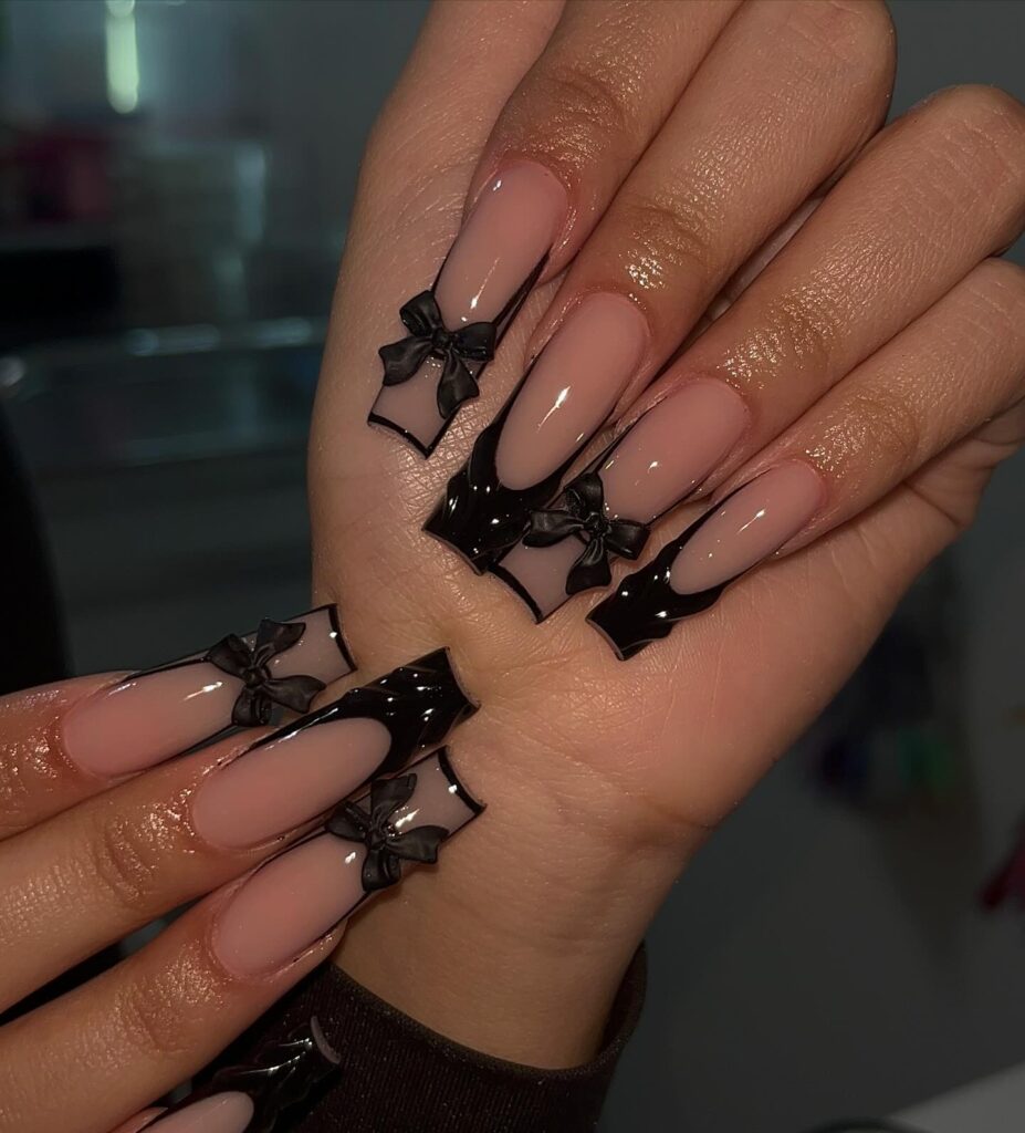 These long coffin nails use a soft nude base paired with glossy black tips. Small black bow accents add a playful and stylish detail.