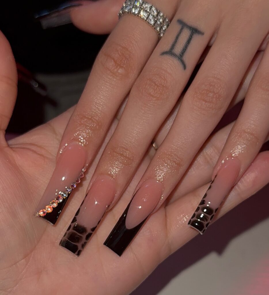 This manicure combines a nude base with bold black tips and textured details. A croc pattern and rhinestone accents add extra dimension to the design.
