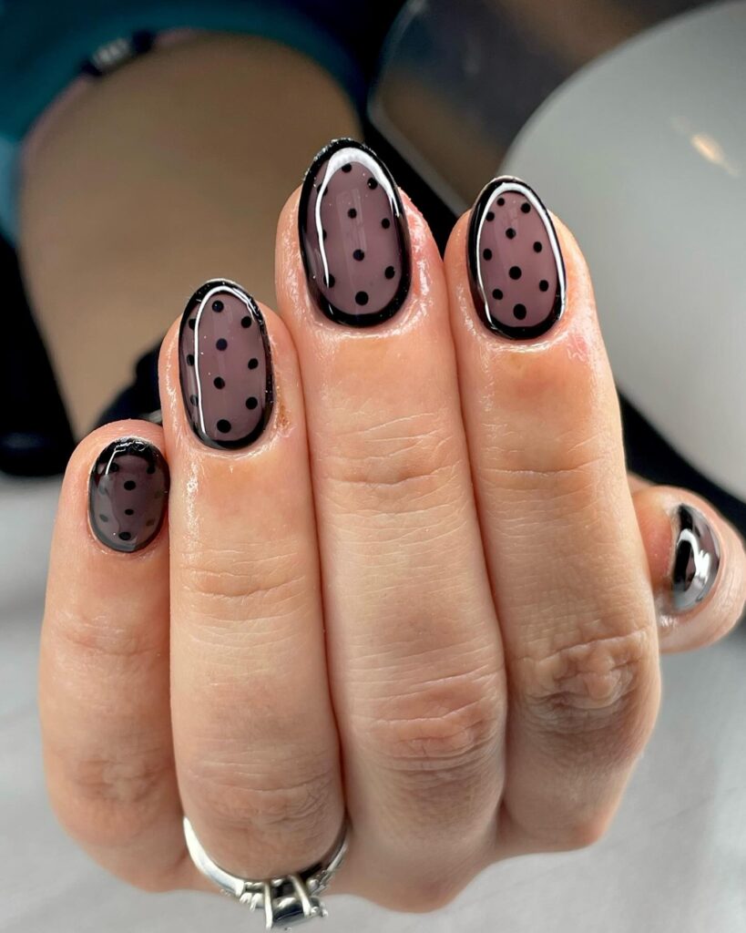 These nails use a smoky sheer base with small black polka dots that create a soft pattern. A glossy black outline frames each nail and defines the shape.