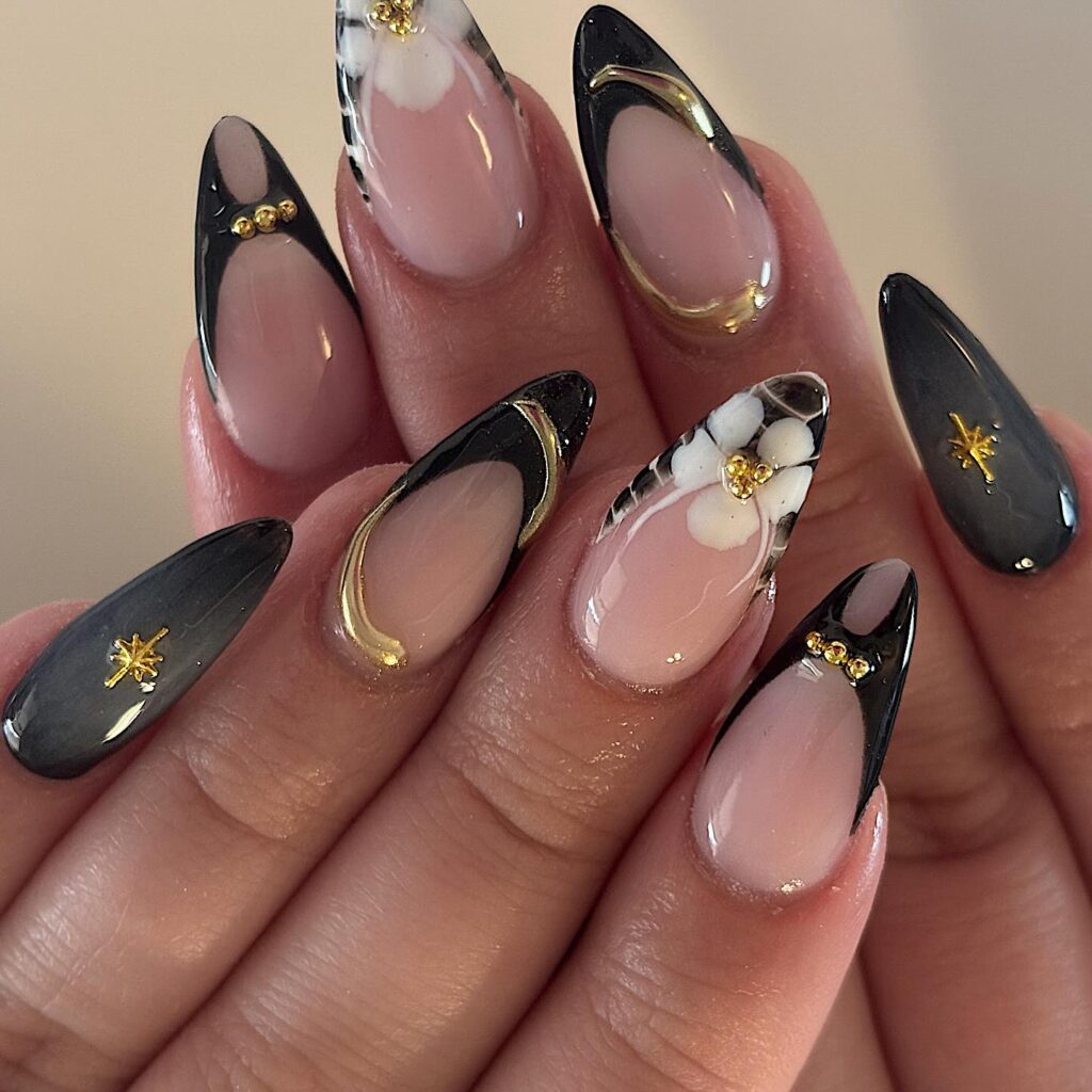 This design blends a nude base with bold black tips and gold accents that create a refined look. The almond shape adds length and gives the nails a polished appearance.