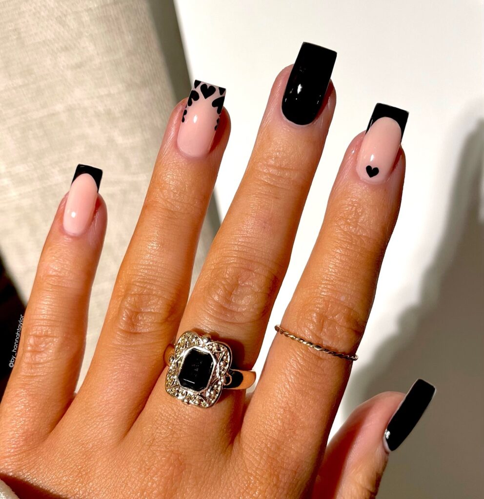 This manicure uses a nude base with clean black tips that give a modern twist to the French style. Small black hearts add a playful detail without making the design too busy.