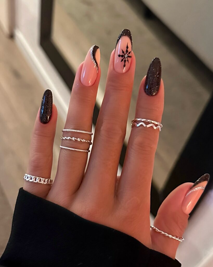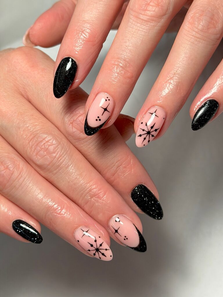 This manicure blends a nude base with black glitter nails and delicate star patterns. The thin black French tips frame the design and add structure.