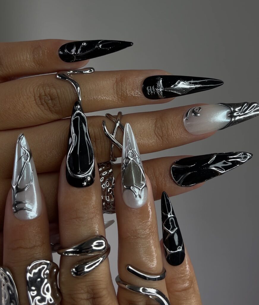 This design combines black polish with silver chrome to create a futuristic effect. Raised metallic patterns add texture and depth to the nails.