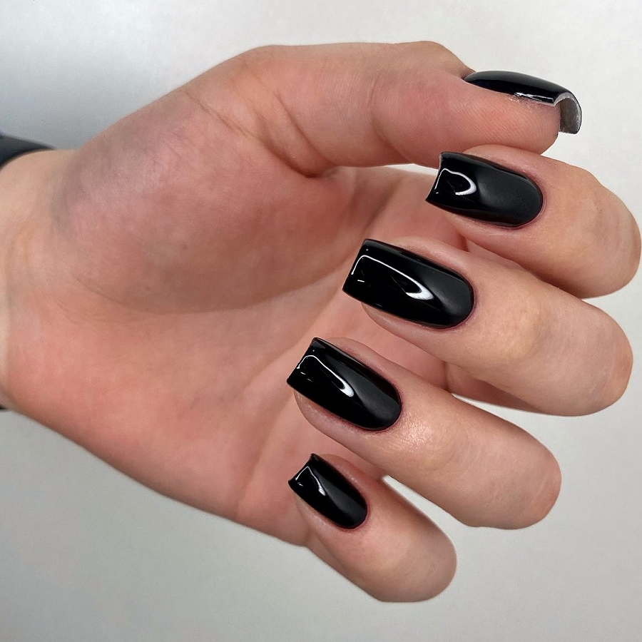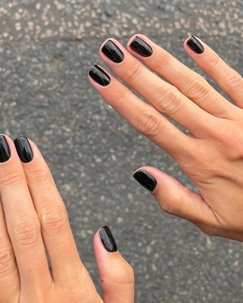 This manicure keeps the nails short with a classic glossy black finish. The clean shape makes the design practical and easy to maintain.