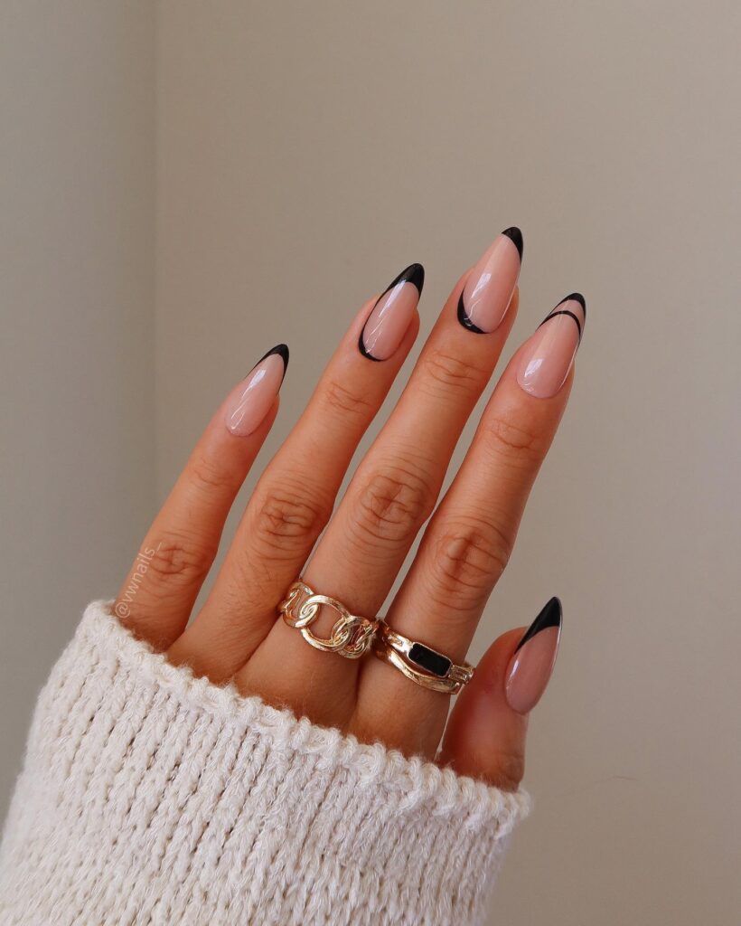This manicure uses a nude base with sleek black French tips that follow the almond nail shape. Some nails include curved black lines which give the design a modern artistic look.