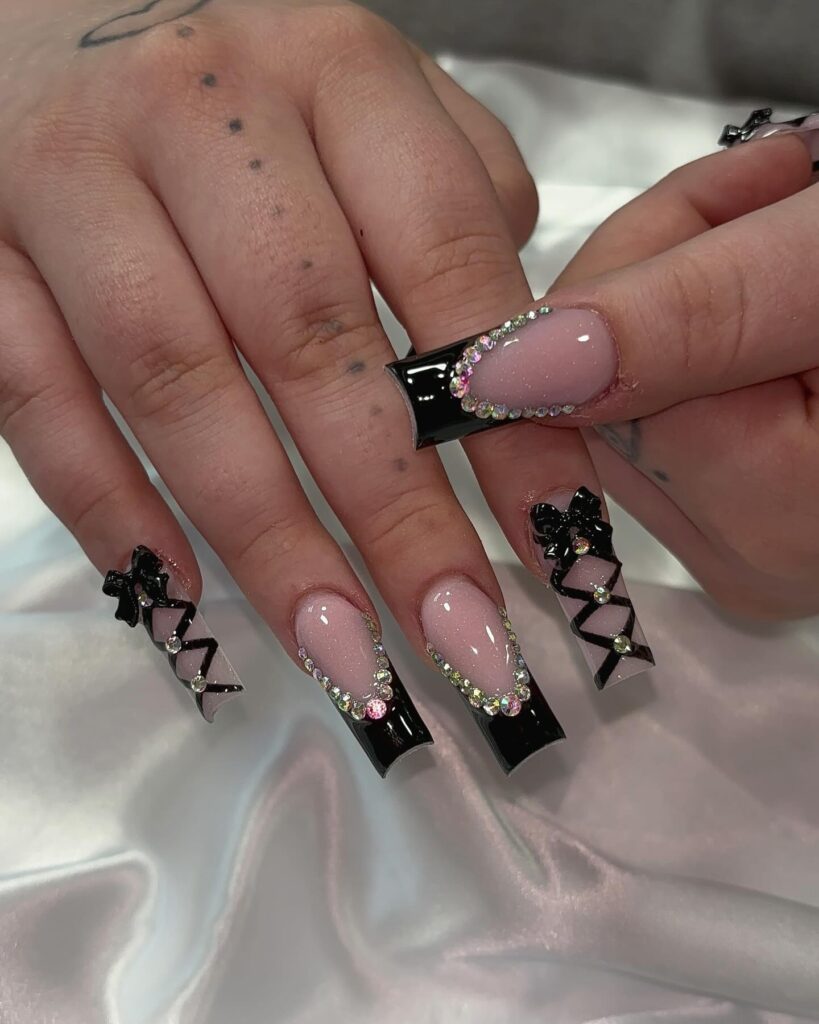 These long square nails feature a nude base with glossy black tips. Rhinestones frame the design and add a glamorous sparkle.