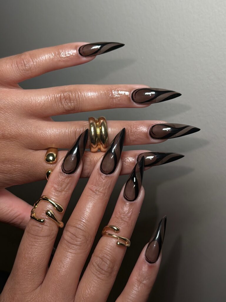 These stiletto nails feature a smoky black pattern that flows across a translucent base. The glossy finish makes the design appear sleek and modern.