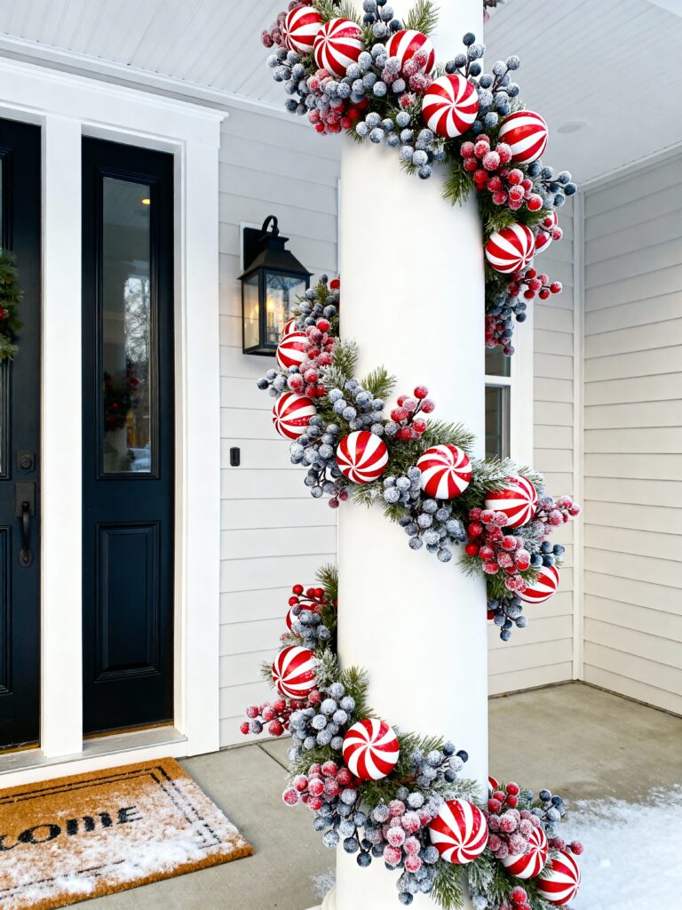 This garland brings a fun candy cane style to your porch. The red and white ornaments pop against the green branches. Frosted berries make it look like they’re covered in snow. Wrapping it around a column gives your entryway a bright, cheerful look. The mix of colors feels happy and full of Christmas spirit. It looks great beside a black front door or white walls. A small doormat and a porch light make it even more inviting. It’s perfect for a family-friendly, playful holiday style.
