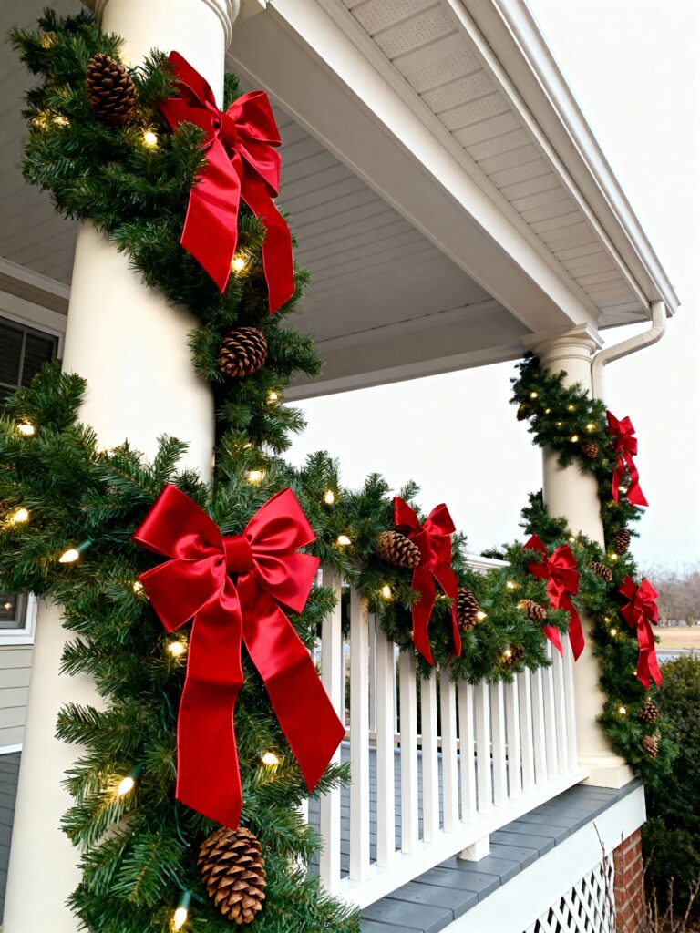 This garland mixes holiday color and soft texture. The deep red velvet bows look rich against dark green branches. Small lights add a warm sparkle that makes the bows shine. It feels fancy but still friendly. The look works best with white railings or light-colored walls. The evenly spaced bows make it look organized and pretty. It gives your porch a clean but bold holiday feel. It’s an easy way to make your home look cheerful and festive.