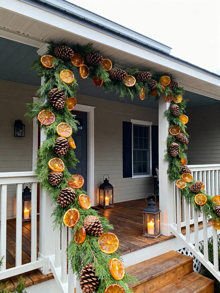 This garland feels homemade and fresh. The mix of pinecones and dried orange slices gives a warm, rustic touch. It looks great with natural wood or farmhouse-style porches. The soft candlelight adds a cozy glow that feels inviting. It’s budget-friendly and easy to make on your own. The oranges give a nice scent and a pop of color. It’s perfect if you want something simple and real. This decoration brings charm without looking too perfect.