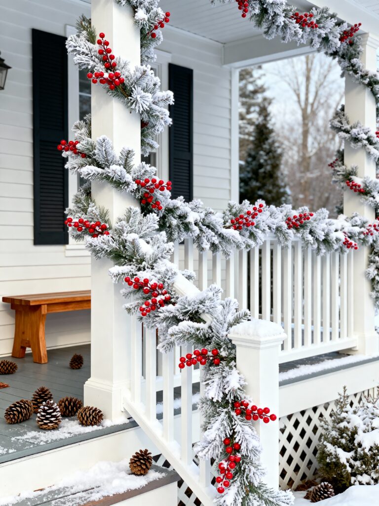 This garland looks like it came straight out of a snowy forest. The frosted branches and bright red berries make a perfect winter look. It’s bright, cool, and full of texture. The snow effect makes it stand out even on gray days. It pairs well with light-colored homes. Pinecones scattered around the steps add a natural finish. It gives the porch a calm and frosty charm. It’s great if you want the snowy look without the real cold.