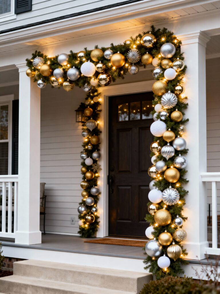 This garland gives a rich and elegant look with shiny gold and silver ornaments. The thick pine branches make it feel full and grand. The ornaments sparkle beautifully under porch lights. It works great if you like a simple but classy holiday theme. Matching wreaths can tie the whole front area together. The mix of metallic colors feels stylish and calm. It’s perfect for large porches that need a bold touch. This look feels both festive and polished.