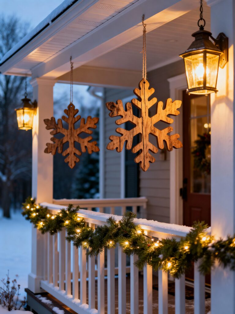 Large Wooden Snowflakes with Porch Lanterns