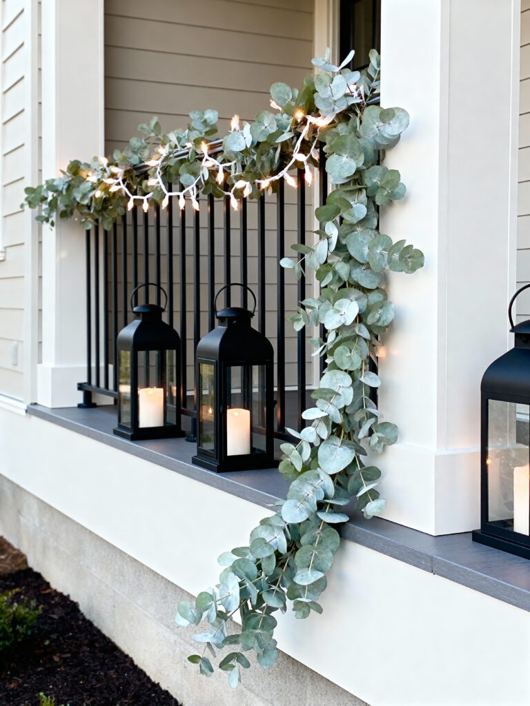 This design is simple and calm, perfect for someone who likes a clean look. The eucalyptus leaves add a soft, natural touch that feels fresh and modern. The string lights make it warm without being too bright. Black lanterns with white candles bring balance and elegance. It’s easy to set up and works well for small porches or balconies. The mix of green and black looks stylish in daylight and cozy at night. It gives your porch a relaxed and welcoming glow. This setup proves that less can feel more during the holidays.