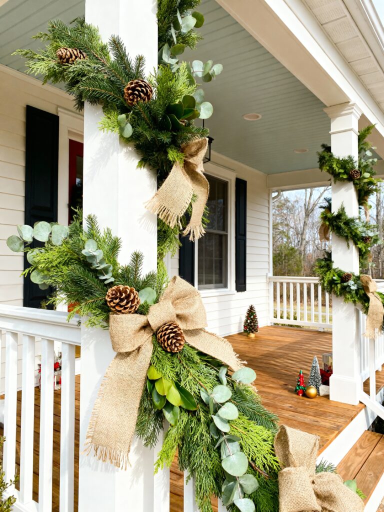 Adding simple touches like lights, ribbons, pinecones, and lanterns brings depth and warmth without making things complicated. Even small porches can look elegant with the right mix of greenery and lighting.