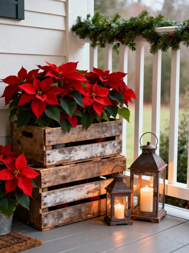 Rustic Crate Display with Poinsettias and Lanterns