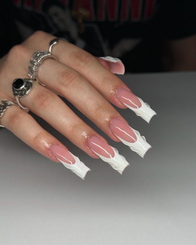 These nails feature a nude base with raised white French tips in a textured design. The 3D detail adds depth and makes the manicure stand out.