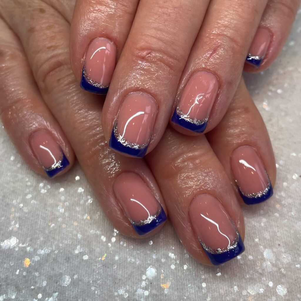 This look uses a natural base with deep blue tips and fine glitter detail. The contrast between nude and bold blue creates a balanced manicure.