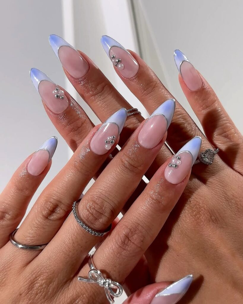 This design features a nude base with light blue French tips and rhinestone details. The crystals add sparkle and make the nails look more stylish.