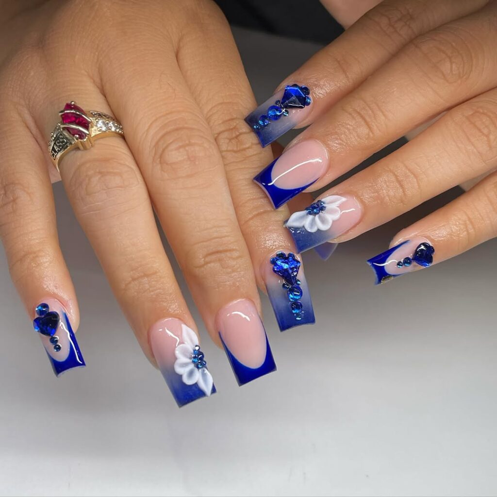 These nails feature a nude base with deep blue French tips and rhinestone accents. The added crystals create a bold and decorative finish.