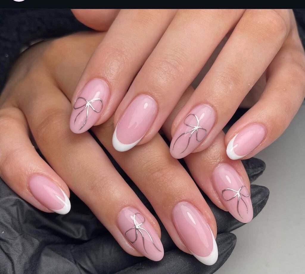 These nails show a soft pink base with classic white French tips and bow nail art. The thin bow designs add a cute and playful element.