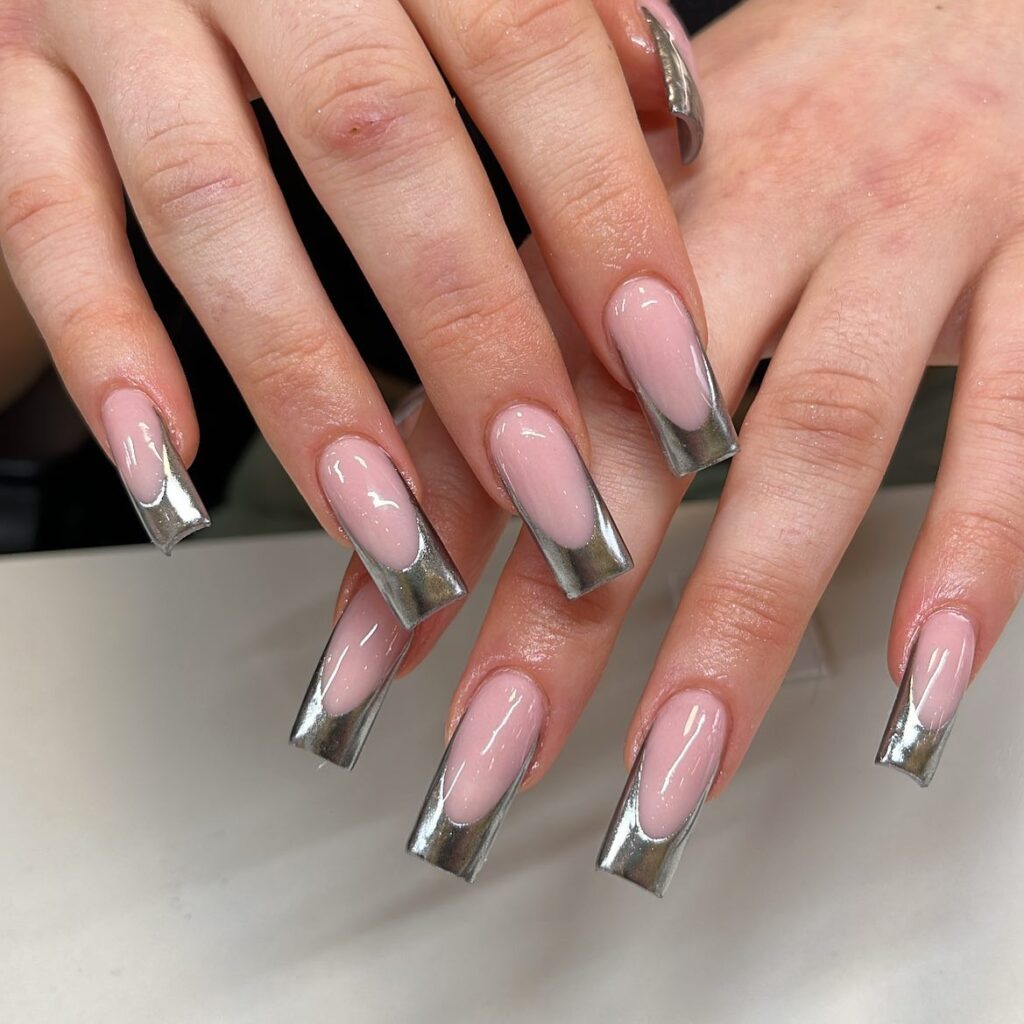 This design shows a nude base with bold chrome silver tips that look modern and sharp. The square nail shape gives a clean and structured finish.