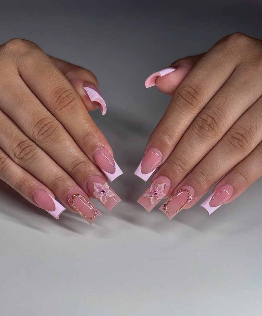 This manicure uses a soft pink base with light pink French tips and floral nail art. The small flowers and gold outlines add a delicate and feminine touch.