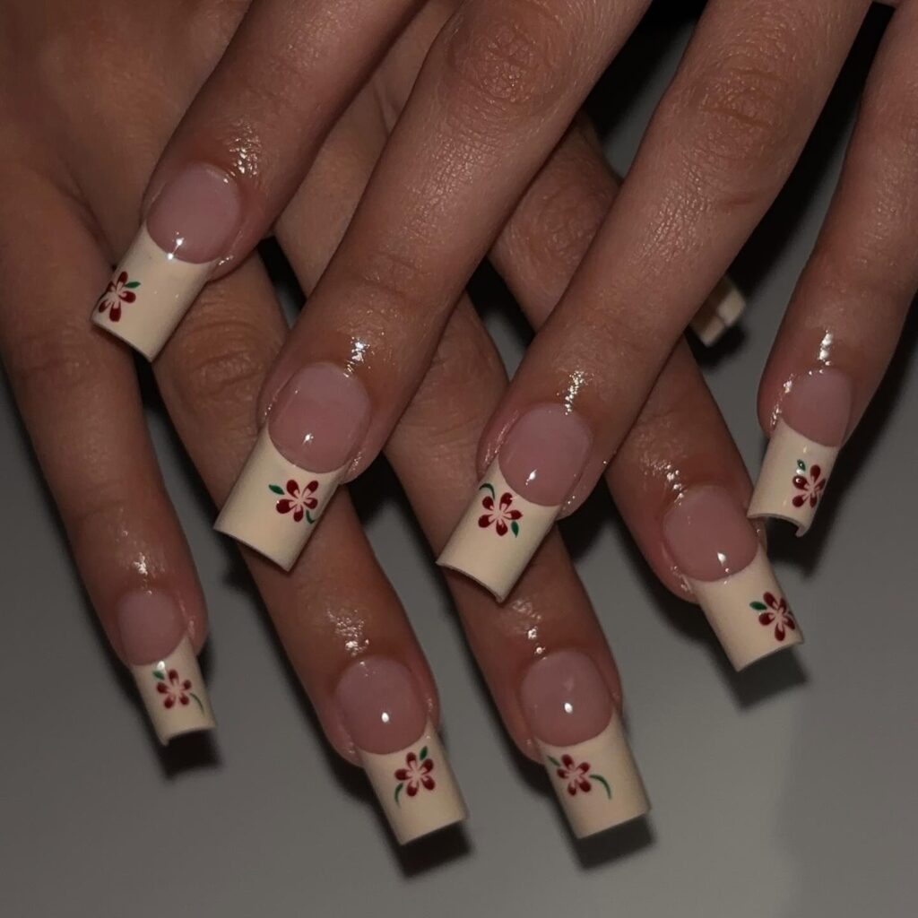 This design shows square nails with a nude base and soft cream French tips. Small floral nail art adds a cute and delicate touch to the overall manicure.