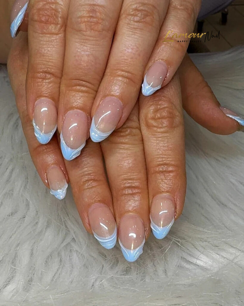 This style shows a nude base with soft light blue tips in a curved shape. The color gives a calm and fresh vibe to the nails.