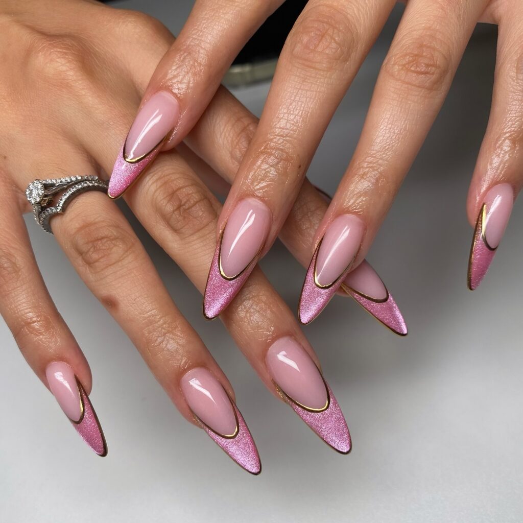 These nails combine a soft pink base with metallic chrome French tips. The thin gold outline adds a luxury detail to the design.