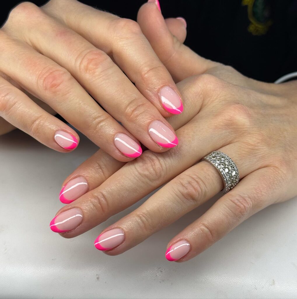 These nails feature a soft nude base with bright pink French tips. The curved tip design adds a feminine and playful touch.