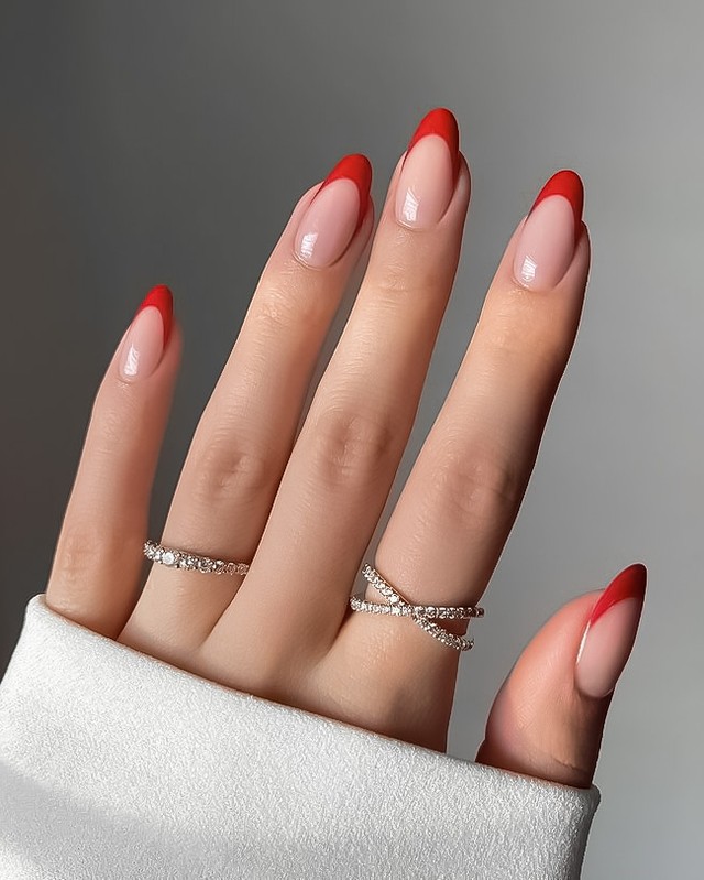 This look uses a nude base with bold red French tips on almond nails. The sharp color contrast creates a strong and eye catching style.