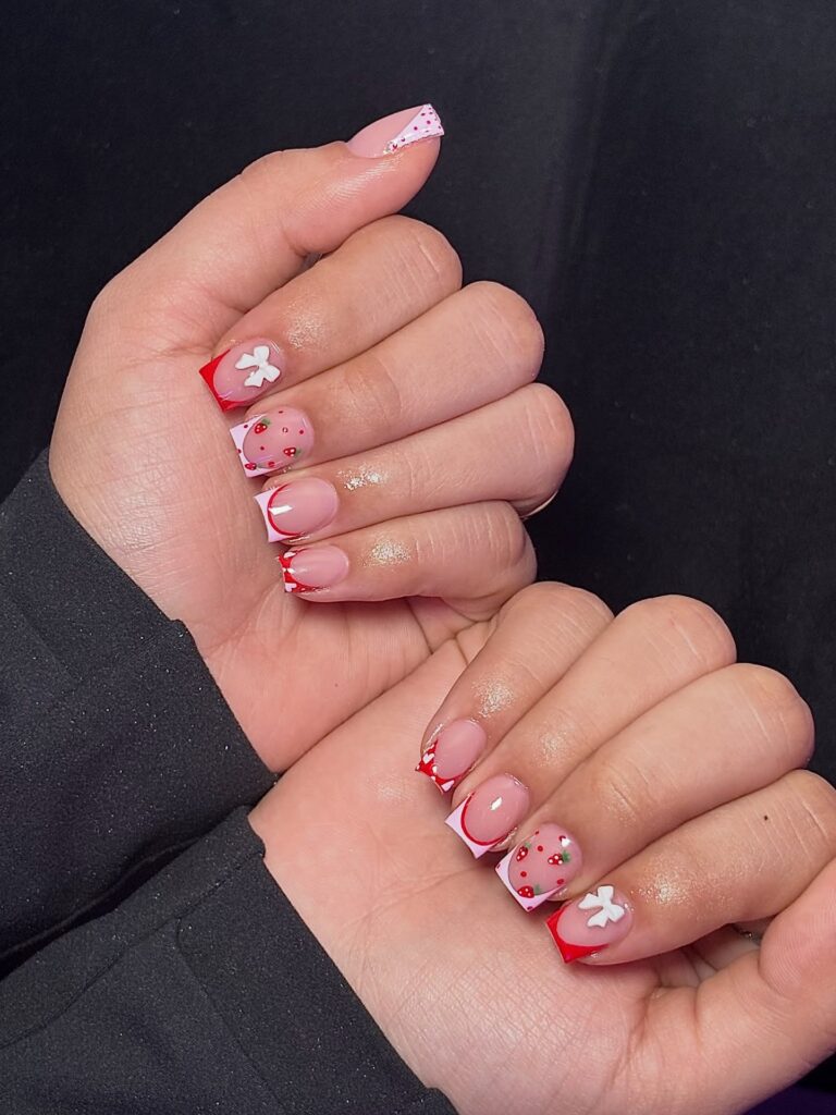 This design uses a nude base with red French tips and playful strawberry nail art. The small patterns give a fun and youthful look.