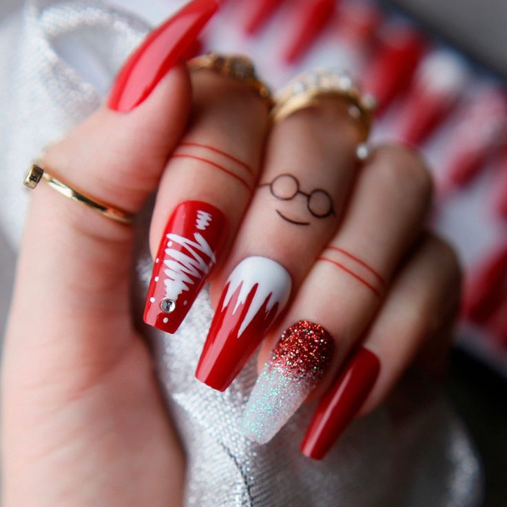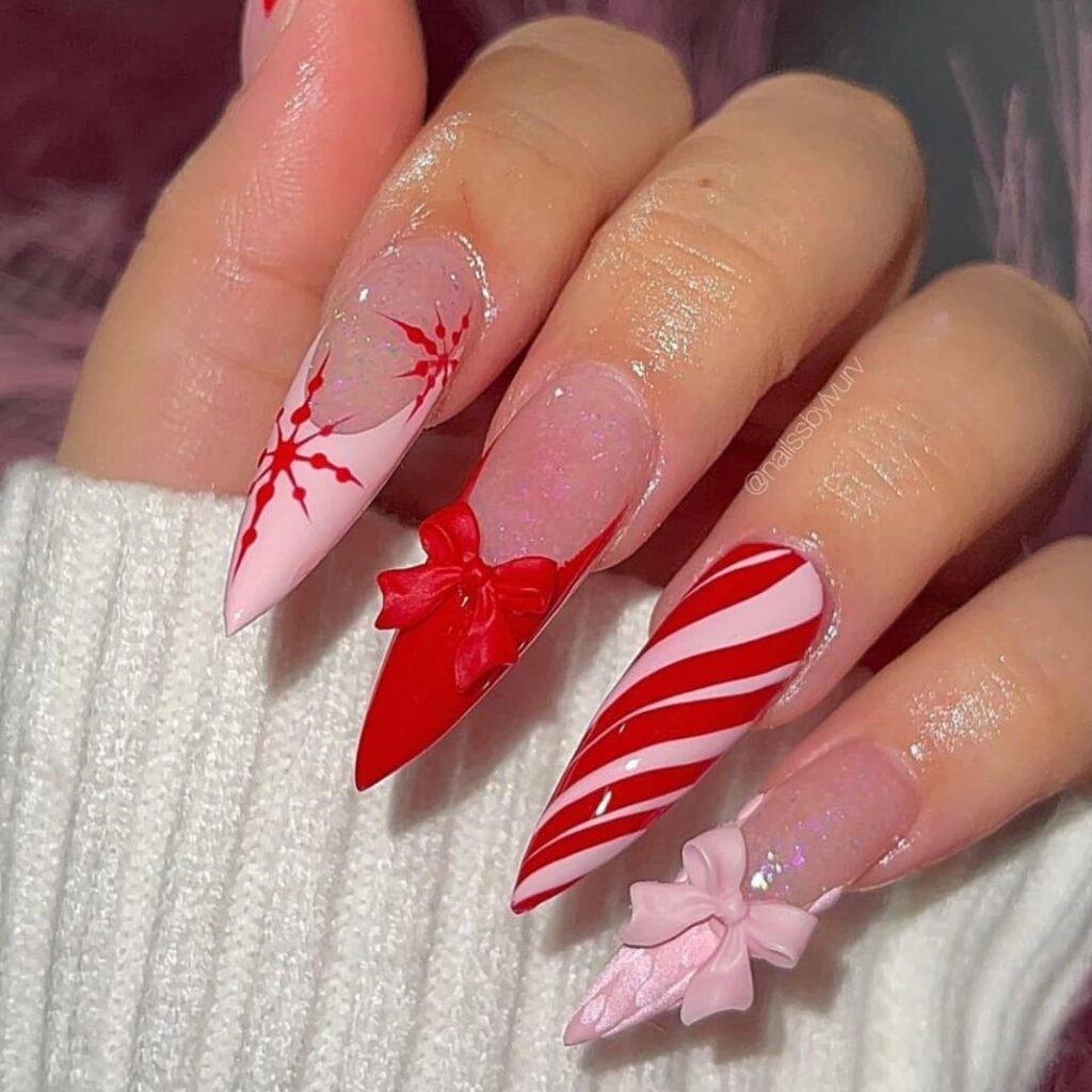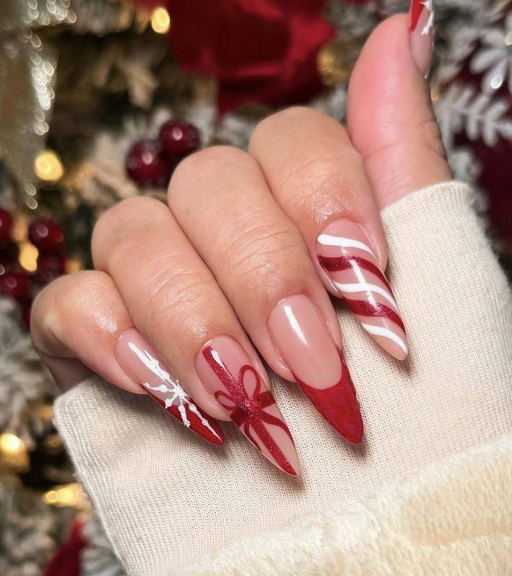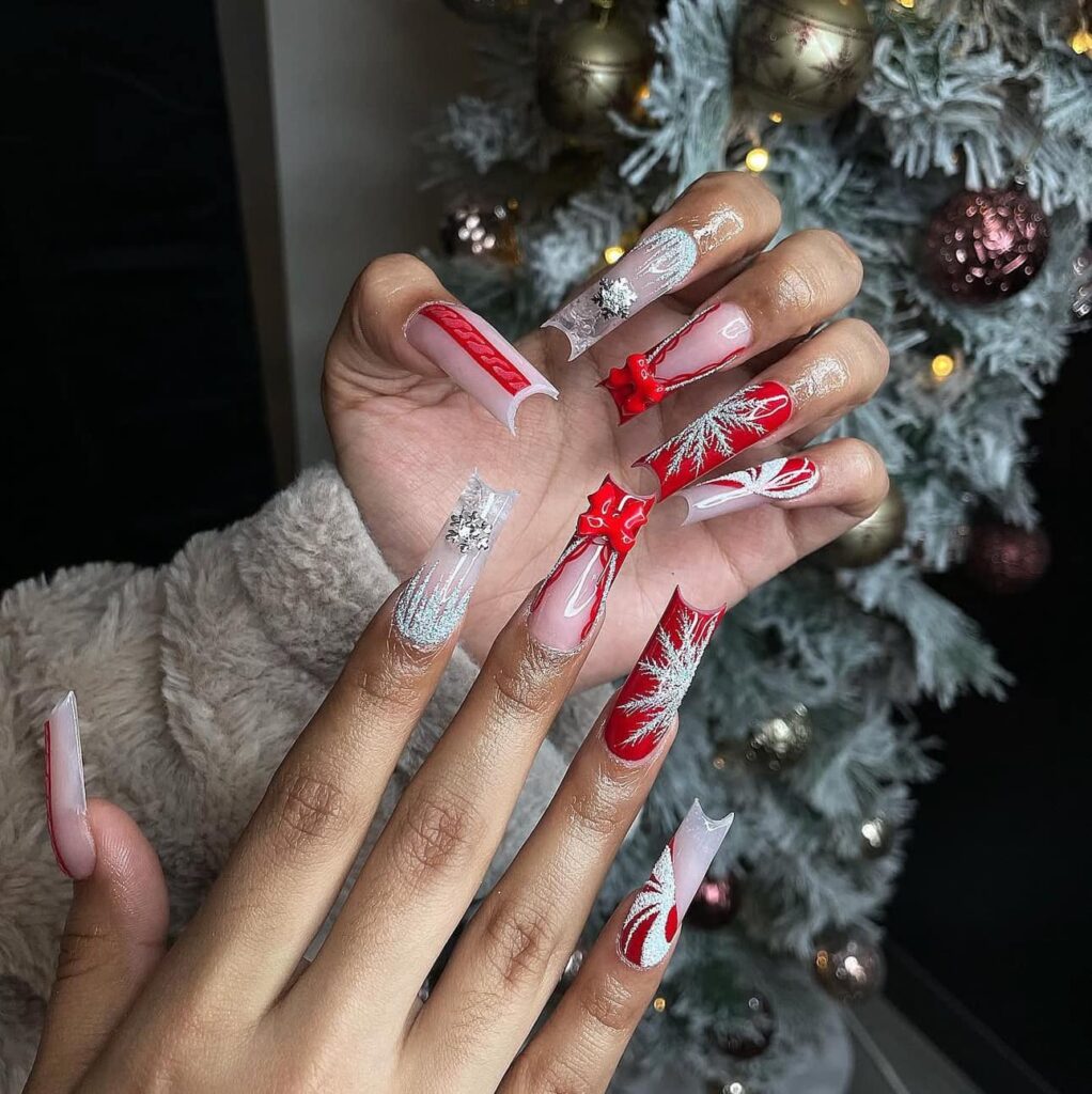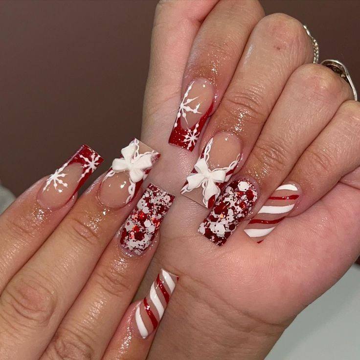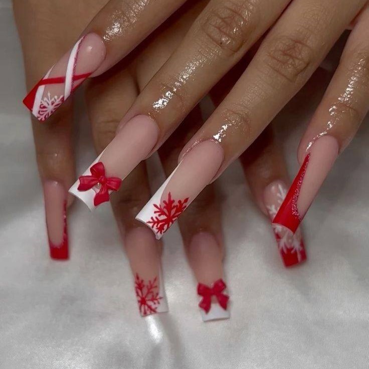 These nails are so detailed and fun Christmas nails. The red and white theme, along with bows and snowflakes, gives a true Christmas vibe you can enjoy in parties, events or holidays.