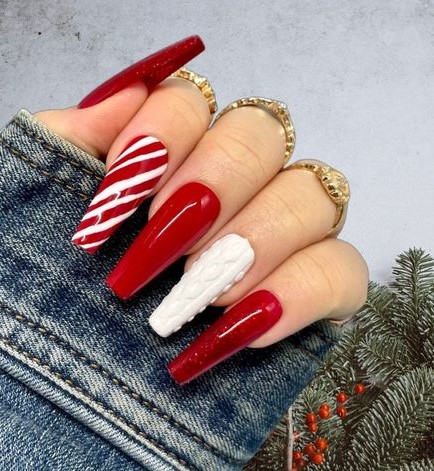 These cute nails mix cozy and festive vibes perfectly to give a charming looks on Christmas. The red and white candy stripes look so cheerful that reminds me of a warm winter sweater.