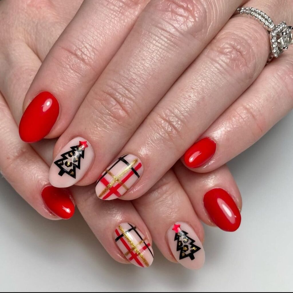 These nails look modern and elegant on the fingers with their mix of red polish and tree designs. The black and gold plaid detail gives a stylish twist while keeping it festive nail art.