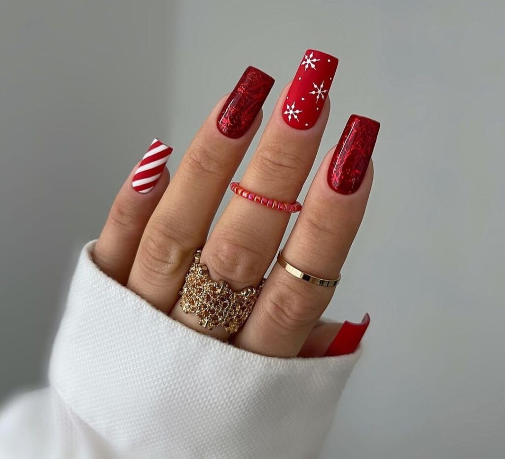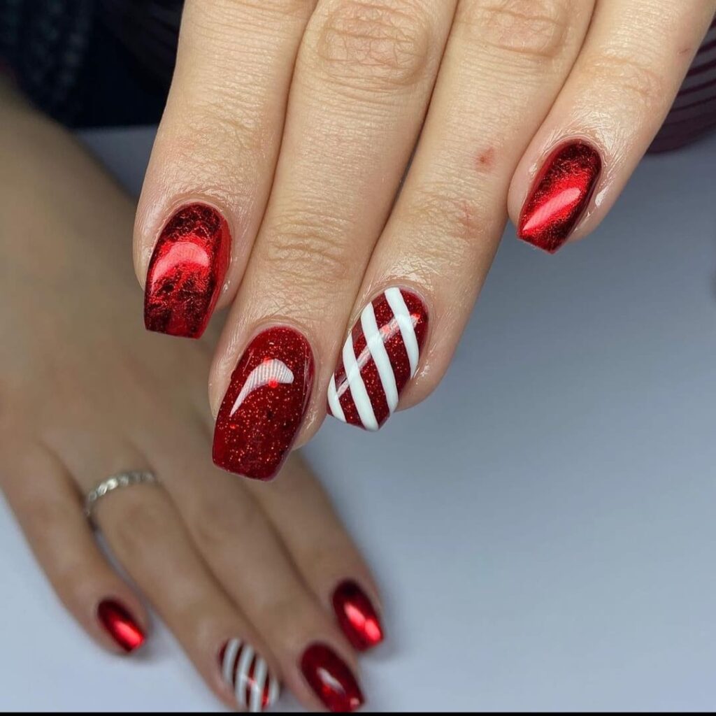 If you like keeping your nails simple, this Red Candy Cane nails design is perfect for you. The glossy red polish mixed with candy cane stripes gives a clean and festive finish.