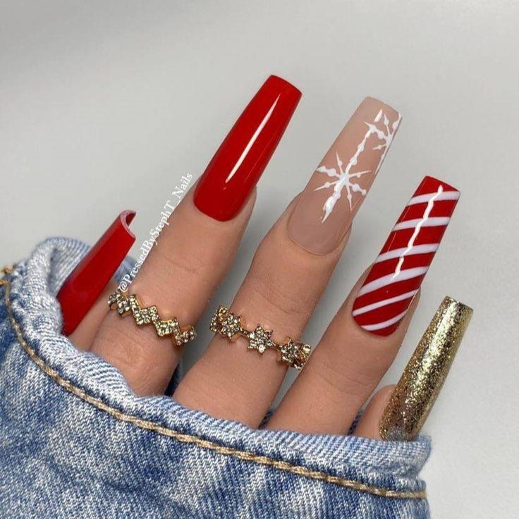 This design is classy with the mix of solid red, gold glitter, and candy cane stripes that gives it a clean and festive look.
