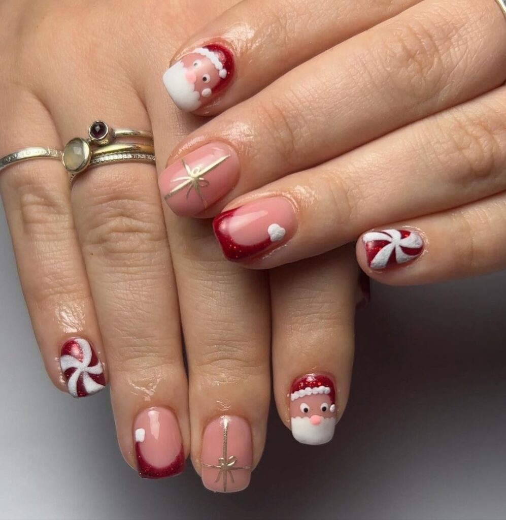 This nail art is my favorite one because of its adorable and playful design. The tiny Santa faces, candy swirl art, and gold ribbon details look like mini Christmas presents on your nails.