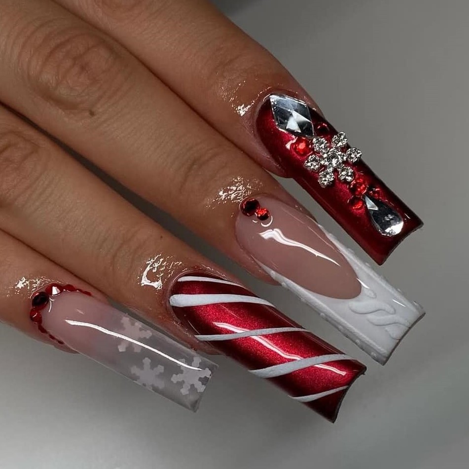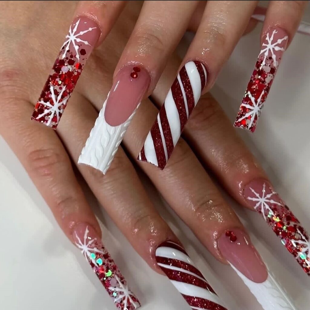 These Long nails scream Christmas fun with the Red color. The mix of red glitter, snowflake art, and candy cane stripes feels like stepping into a holiday Christmas movie.