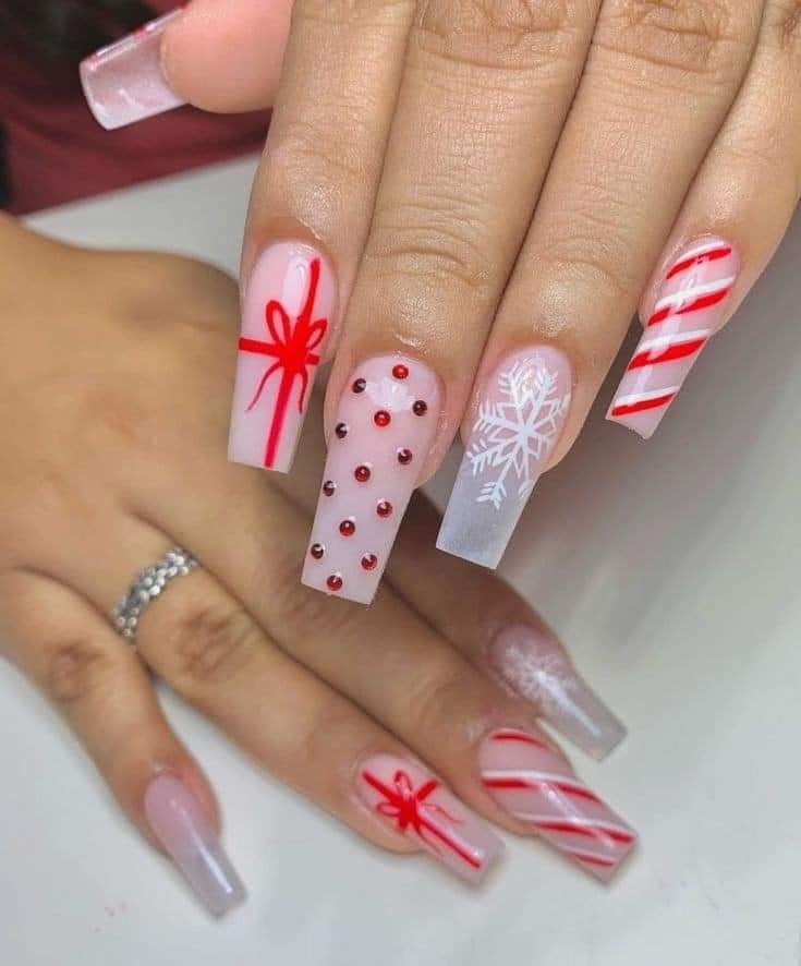 These gift nails feel playful with a polished nails for Christmas. The clear frosted look with red ribbons, candy cane stripes, and snowflakes show their holiday energy.