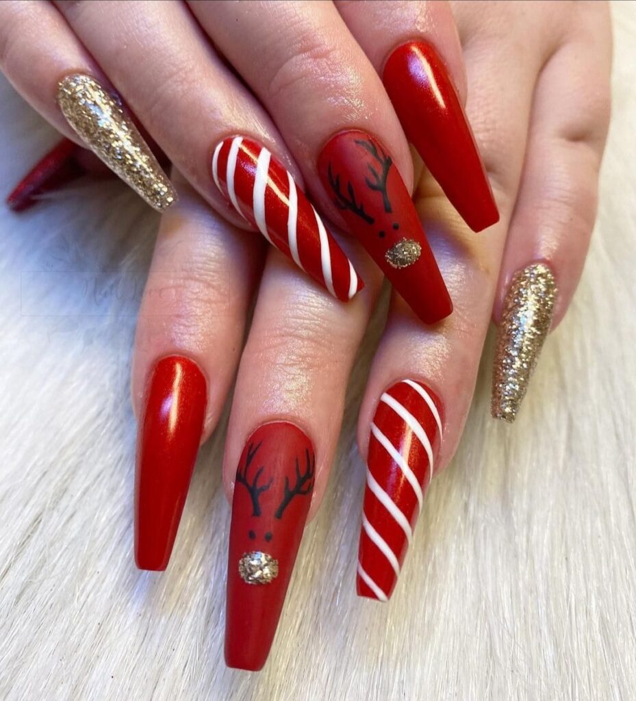 These best nails combine everything festive in a one look that gives cozy vibes. The red and white candy cane stripes, gold glitters, and cute reindeer art make these nails look fun and warm for you.