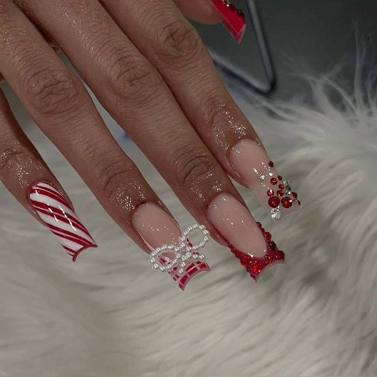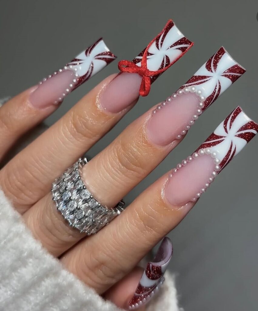 These nails are elegant with a glamorous twist that has pearls. The white and red swirls look like peppermint candy, and the pearls add a fancy finish to the nails.