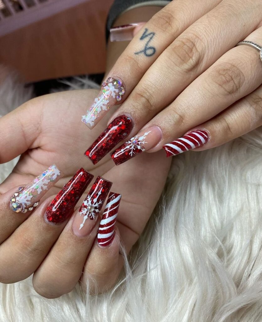 You can never go wrong with these Red snowflake nails. The red polish, white snowflakes, and candy cane details make these nails my Christmas favorite.