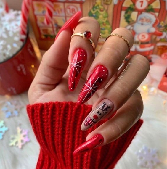 I love how these long, pointed nails make every small design stand out for the Christmas Season. If you enjoy creative nail art, then this one is my top recommendation for you to show off your holiday spirit.