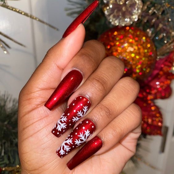 This style is bold and bright that stands on a Christmas. The metallic red polish and white snowflake art look like Christmas lights reflecting on snow through the hands.
