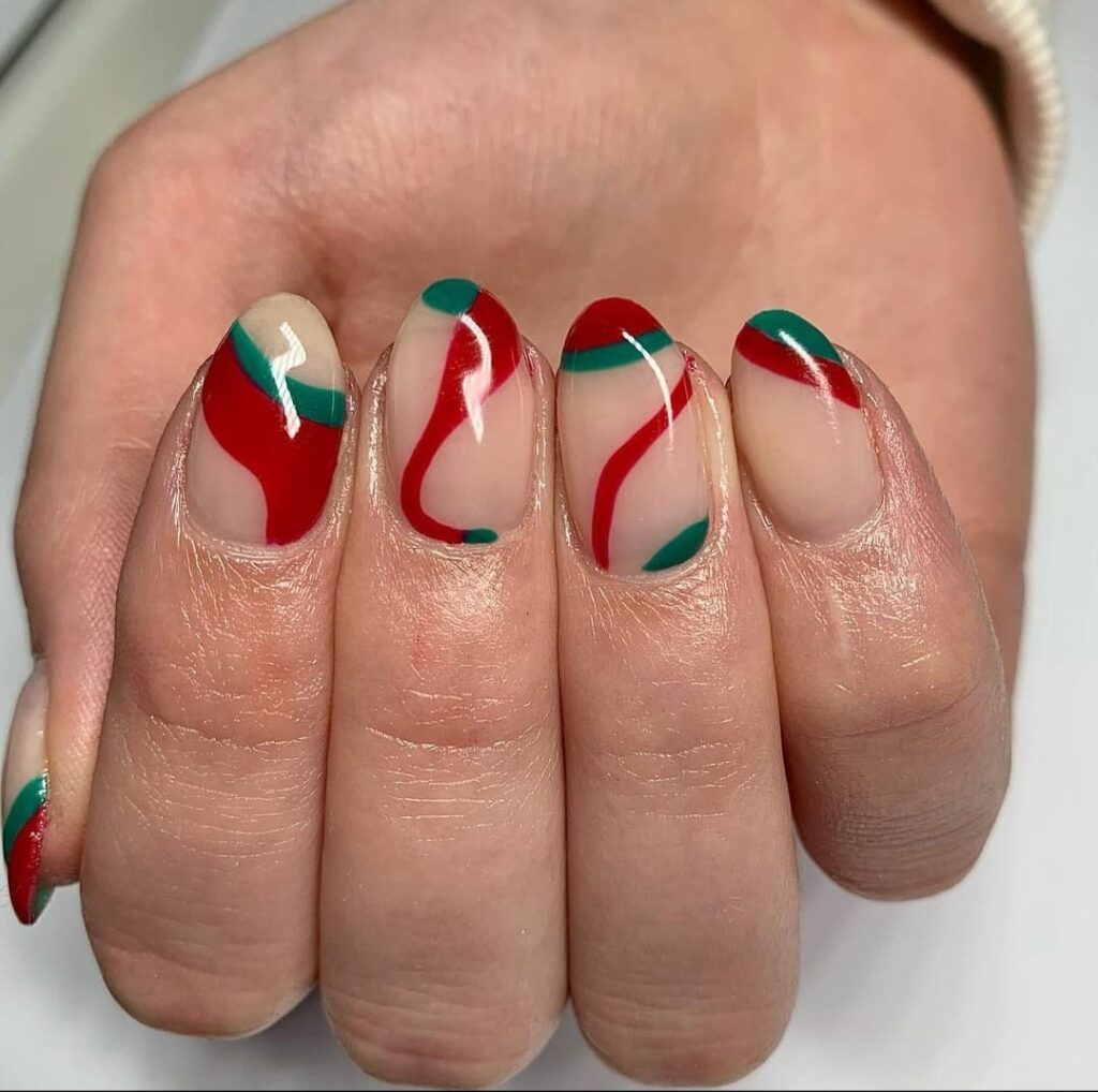 These swirl nails are fun, trendy, and simple nails. The red and green swirl lines on a nude base give a candy-cane-inspired look without too much detail on the nails.