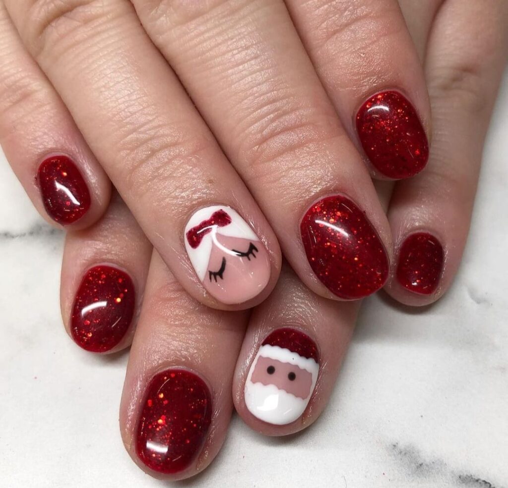 These short red glitter nails are so cute and I am love with these. The design with Santa’s face and the red bow gives a cozy, playful Christmas Cozy vibe.