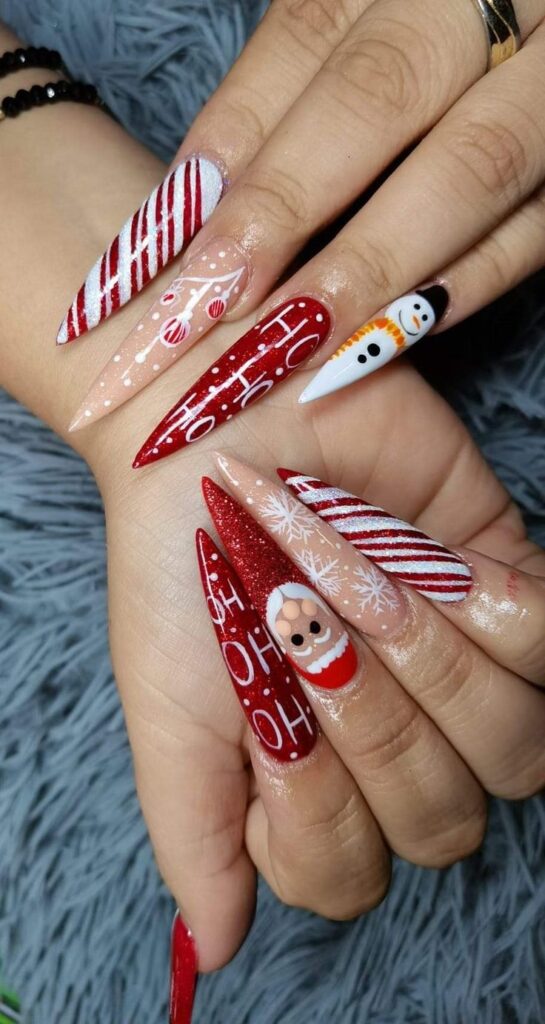 These nails are one of the best and look like a full Christmas story. The “Ho Ho Ho” design, candy cane stripes, and snowman details with Santa face at the tip adds a cute, personal touch to the long stiletto nails.