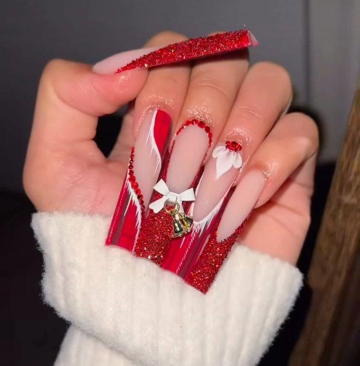 These nails are bold and very creative. The red glitter with white stripes, 3D bow, and tiny gold bell charm give a festive look that’s impossible to ignore on the Christmas.
